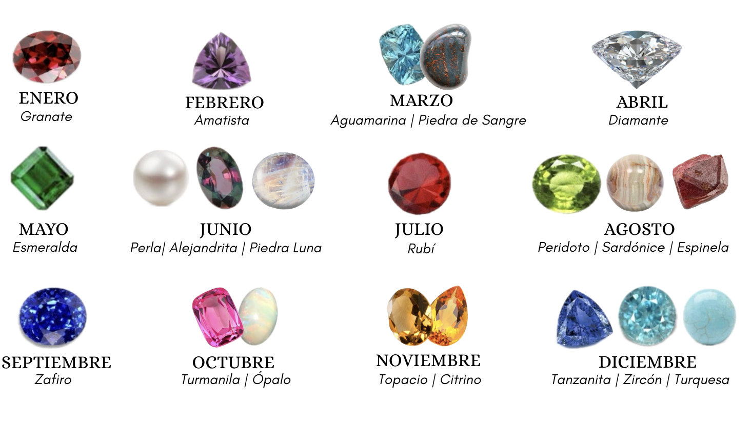Sin profundizar en cada uno, porque cada piedra merece su propia historia, basta saber que el calendario se viste de gemas: