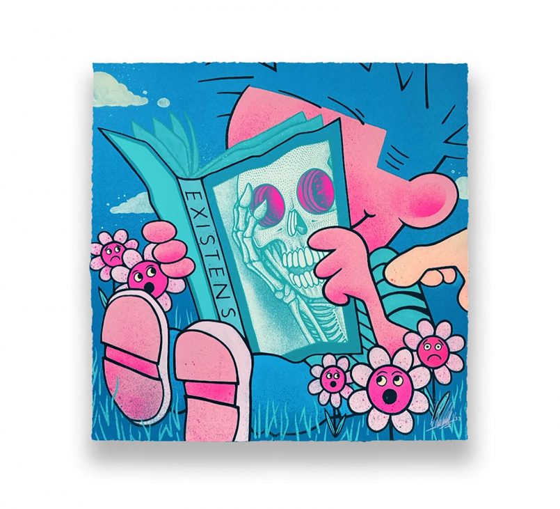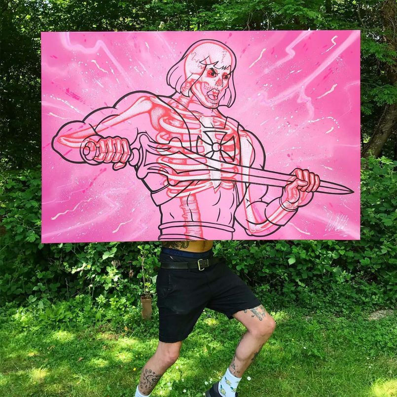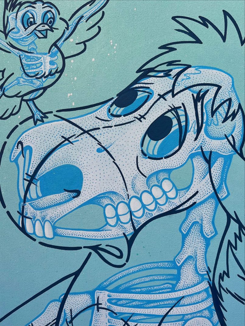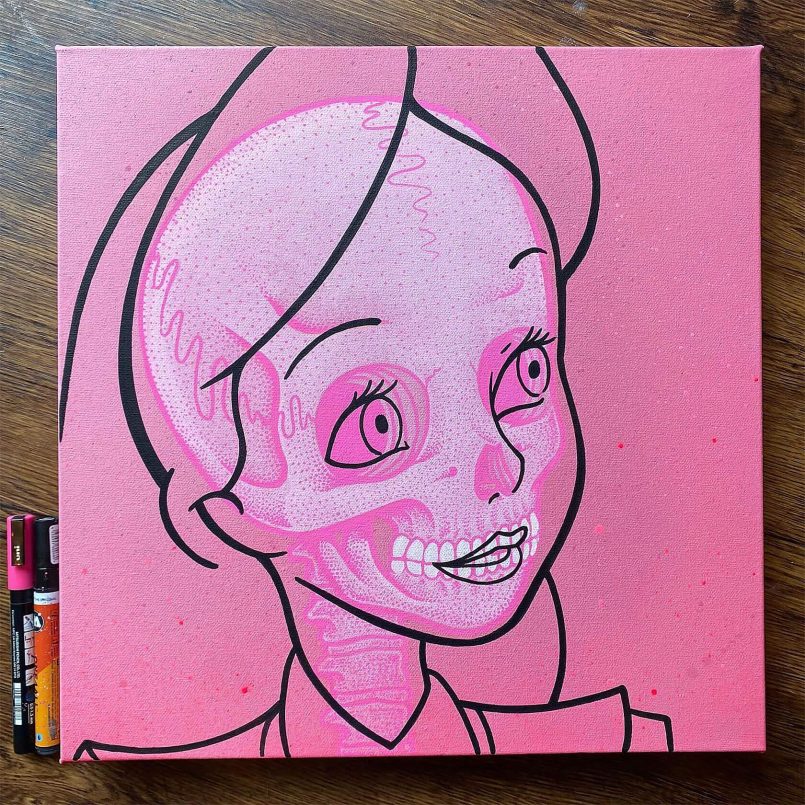 Lo fascinante es cómo Blood combina la estética limpia de las caricaturas con capas minuciosas de anatomía. Rosa chicle, azul eléctrico, naranja ácido: la paleta de tu tazo de los 90’s, pero aplicada a una calavera con ojitos de caricatura. Un contraste que pega como mezclar Choco Milk con mezcal: raro, pero funciona.