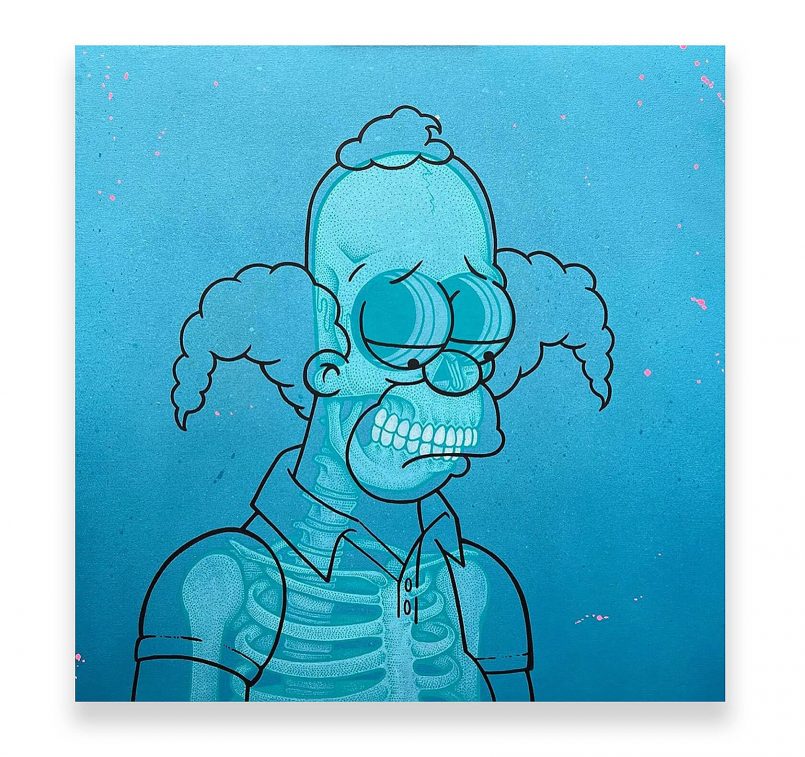 Porque en un mundo donde los algoritmos reciclan hasta la risa enlatada de Friends, ver a Bart Simpson desollado se siente fresco. Will Blood no solo juega con íconos, juega con la idea de la eternidad pop: ¿qué pasa cuando lo eterno se oxida? Su arte nos lo responde en technicolor: el mito sigue vivo, aunque el esqueleto ya esté en vitrina.
