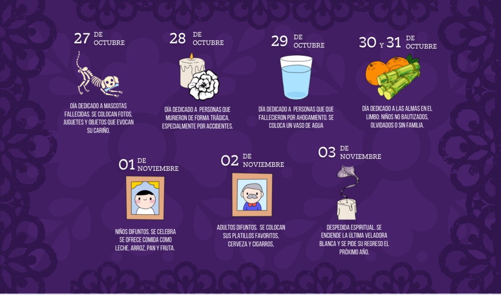 La celebración del Día de Muertos se extiende a lo largo de varios días, cada uno con un significado especial para recibir a diferentes espíritus. Con la llegada del cristianismo, las prácticas ancestrales se adaptaron al calendario católico: el 1 de noviembre se dedica a los niños y el 2 de noviembre a los adultos. En tiempos recientes, el 27 de octubre se ha reservado para honrar a las mascotas fallecidas.