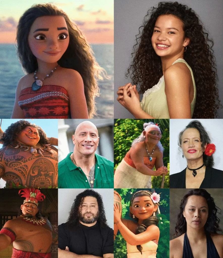 El reparto fue uno de los anuncios más importantes, destacando la elección de la joven Catherine Laga’aia para el papel principal de Moana, en lo que será su debut cinematográfico. La actriz, de raíces polinesias, fue una elección celebrada por su autenticidad cultural.