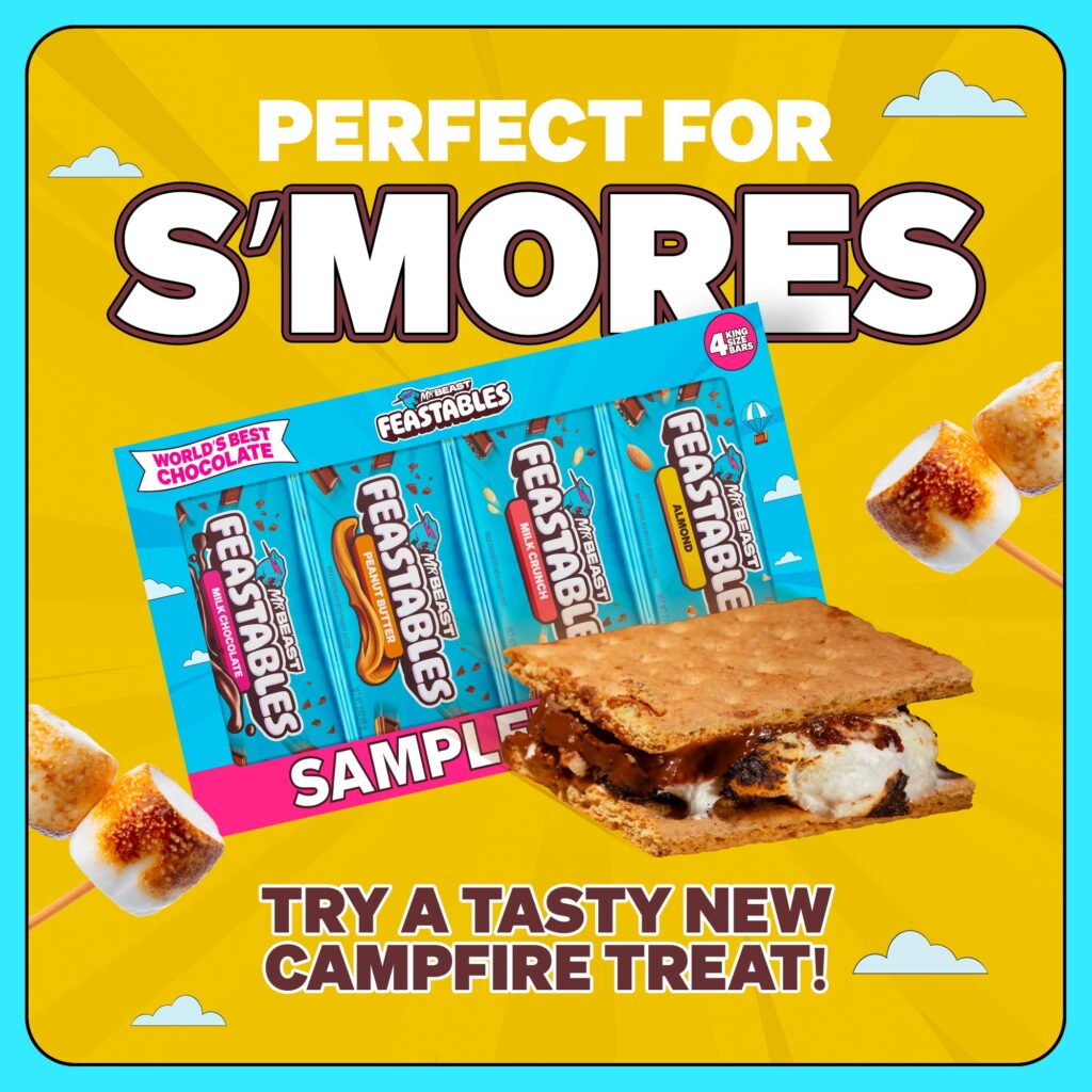 El éxito de las barras impulsó a MrBeast a experimentar con nuevas categorías. Este año, Feastables presentó sus malvaviscos y snacks S’mores, una reinterpretación del clásico americano: galleta crujiente, malvavisco suave y chocolate Feastables en un solo bocado.