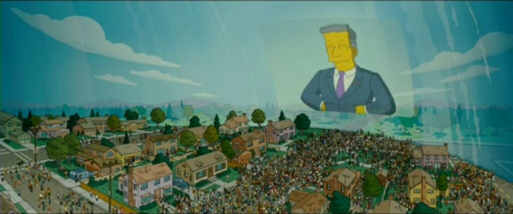 En 2007, la trama principal de la película parecía una exageración caricaturesca: para contener una crisis ambiental provocada por Homer, el gobierno de los Estados Unidos (encabezado por la EPA) decide encerrar a toda la ciudad de Springfield bajo un domo de cristal irrompible.
